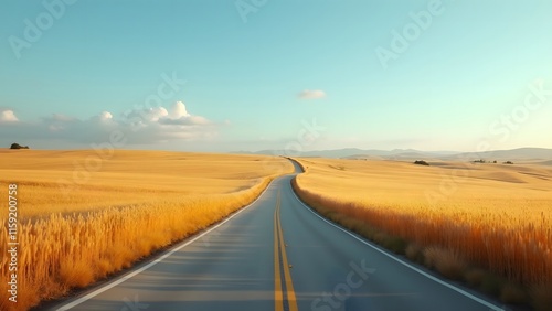 Naklejka premium Golden Wheat Field Road Winding Asphalt Scenic Summer Landscape