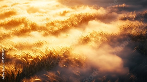 © Shehlla Saeed, Fototapeta premium Golden wheat field shimmers in the sunlight, creating a dreamy and ethereal landscape with a soft, hazy atmosphere perfect for conveying peace and tranquility.
