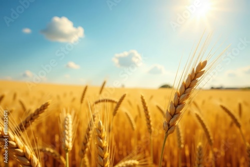 Fototapeta premium Golden wheat field, sunlit waves gently swaying in summer breeze , sun, grain