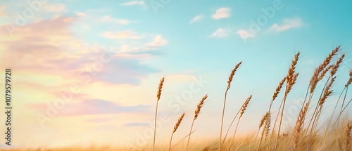 Obraz premium Golden wheat field swaying in the gentle wind under a vibrant colorful sky...