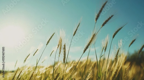 Fototapeta premium Golden wheat field sways gently in the breeze under a clear blue sky, with vibrant green leaves and tall stalks illuminated by sunlight