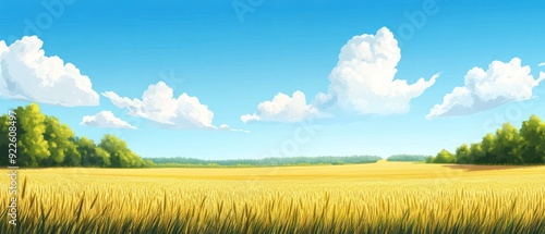 © raja, Naklejka premium Golden Wheat Field Under a Blue Sky with Fluffy Clouds