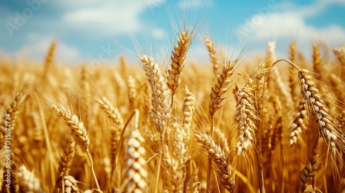 Fototapeta premium Golden wheat field under a bright blue sky.