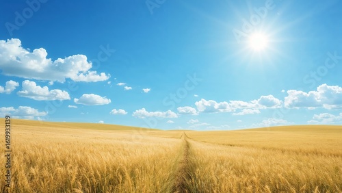 © RajIT, Obraz premium Golden wheat field under a bright blue sky with fluffy white clouds and shining sun