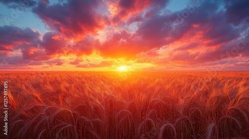 Fototapeta premium Golden wheat field under a vibrant sunset sky with dramatic clouds,...