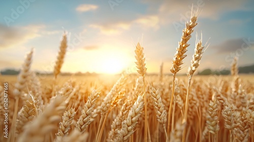 Fototapeta premium Golden Wheat Field Under Beautiful Sunset Sky with Soft Clouds