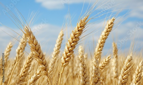 Fototapeta premium Golden wheat field under blue sky, ready for harvest, agriculture background