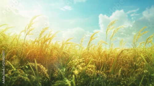 Fototapeta premium Golden Wheat Field Under Blue Sky with Fluffy Clouds and Sunshine