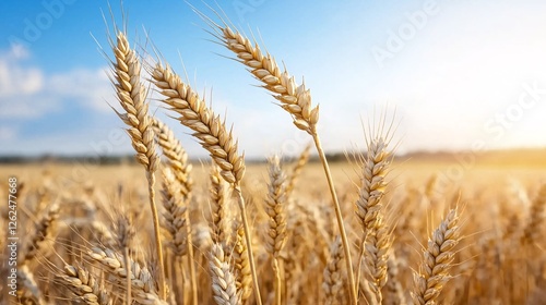 Fototapeta premium Golden Wheat Field Under Bright Blue Sky and Warm Sunlight