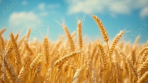 Fototapeta premium Golden Wheat Field Under Bright Blue Sky with Fluffy Clouds