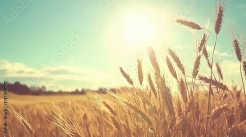 Fototapeta premium Golden Wheat Field Under Bright Sunlight with Clear Blue Sky