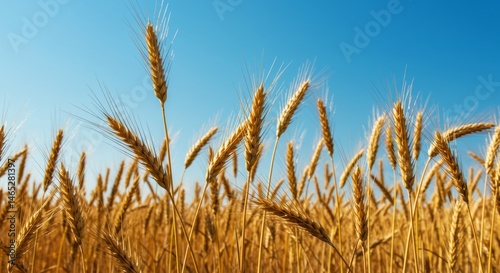 Fototapeta premium Golden Wheat Field under Clear Blue Sky evokes Peaceful Harvest Time