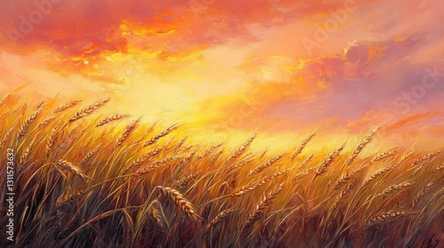 Obraz premium Golden Wheat Field Under Vibrant Sunset Sky with Fiery Orange and Soft Pink...