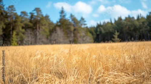 Fototapeta premium Golden wheat field with a forest backdrop. Perfect for nature, agriculture, or rural themed projects.