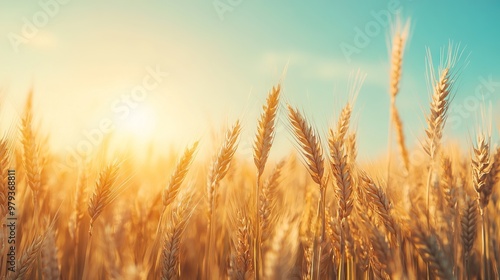 Fototapeta premium Golden Wheat Field with Blue Sky and Sunlight - AI generated illustration
