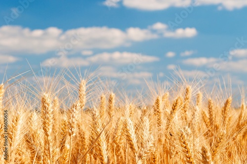 © kviktor, Fototapeta premium Golden wheat field with blue sky and white clouds in background