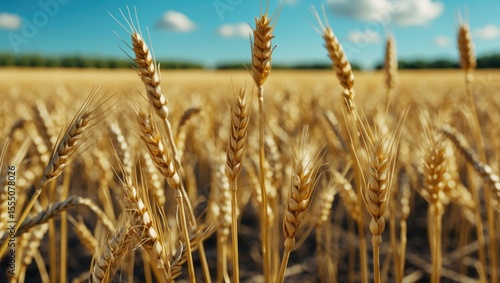 Fototapeta premium Golden wheat field with ripe stalks ready for harvest under a blue sky.