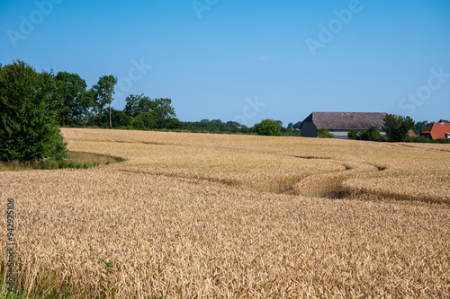 © Werner, Fototapeta premium Golden wheat fields against blue sky at seaside around Neukirchen, Germany
