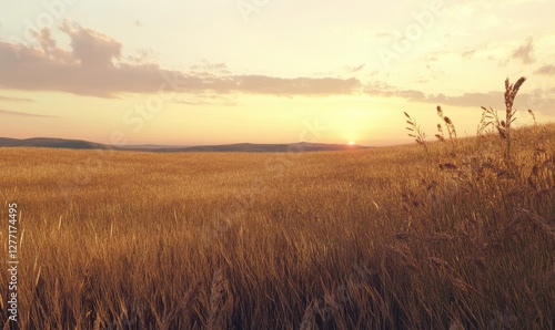 © Tanya, Obraz premium Golden wheat fields bathed in the warm glow of sunset, the horizon blending into soft pastel skies, a serene rural landscape with rich agricultural textures,