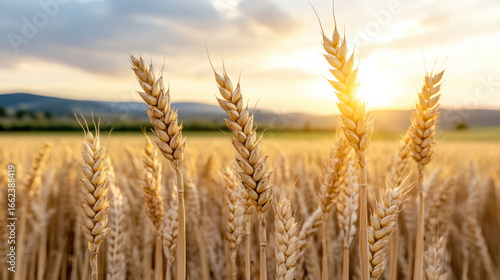 Fototapeta premium Golden wheat fields glowing under sunset, creating serene atmosphere
