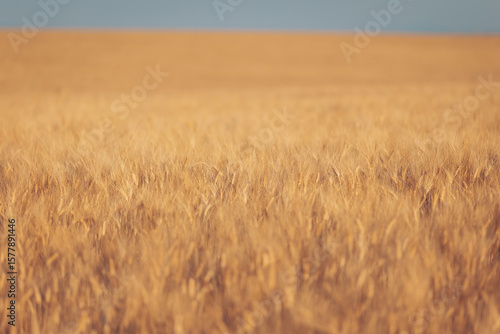 Obraz premium Golden wheat fields stretch endlessly under a clear blue sky during the late afternoon light