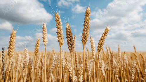 Fototapeta premium Golden wheat fields sway gently under bright blue sky with fluffy clouds