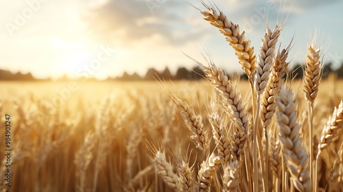 © iamtopkritsada, Fototapeta premium Golden wheat fields swaying in unison under a summer breeze, rhythmic agricultural flow, calming rural landscape