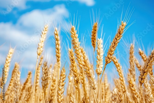 © Ольга Лукьяненко, Fototapeta premium Golden wheat grain ready for harvest under blue sky