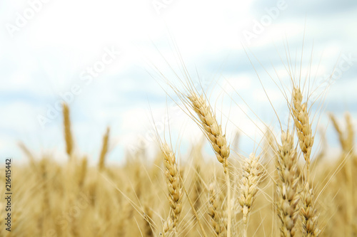 © New Africa, Fototapeta premium Golden wheat in grain field. Cereal farming