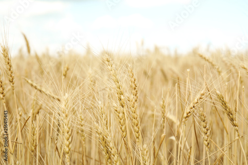 Fototapeta premium Golden wheat in grain field. Cereal farming