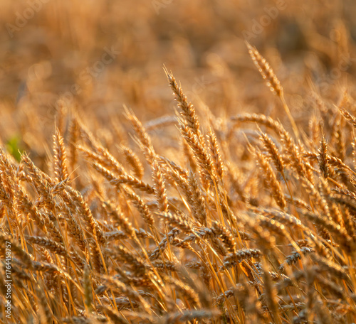 Fototapeta premium Golden wheat patterns and grain texture in morning light with blurred field...