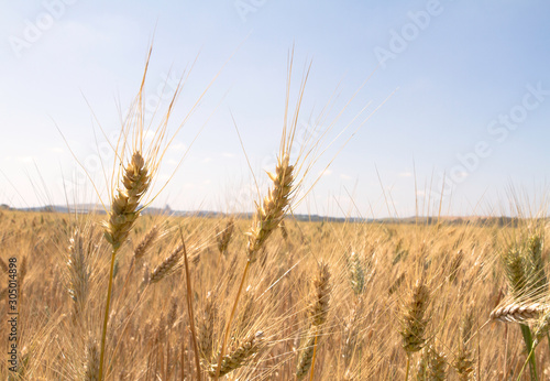 Obraz premium Golden wheat spike growing. Organic and healthy. flour and bread