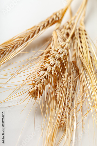 © fotofabrika, Obraz premium Golden wheat stalks are laid on a plain surface in bright natural light during the daytime
