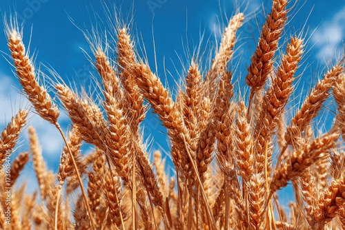 © Pan, Fototapeta premium Golden wheat stalks reach upwards toward a brilliant blue sky with wispy clouds
