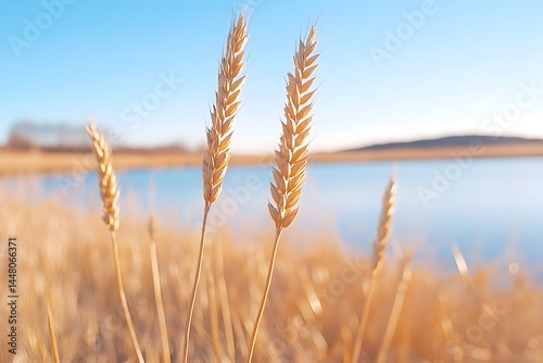 © Mohan, Fototapeta premium Golden wheat stalks stand tall near calm water under a clear blue sky