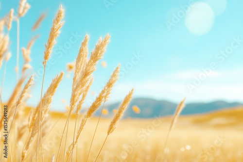 Fototapeta premium Golden wheat stalks swaying in the sunlit field against a clear blue sky,...