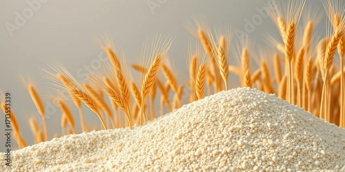 © Nopphawan, Obraz premium Golden wheat stalks transitioning into a pile of flour, meal, sunlight
