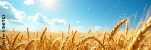 Fototapeta premium Golden wheat swaying gently under a vast blue sky, bathed in sunlight ,...