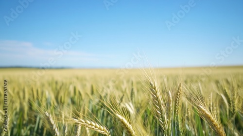 © Marina, Obraz premium Golden wheat sways gently in sunlight under expansive blue sky,