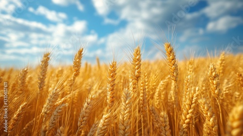 Fototapeta premium Golden wheat sways gently under a bright summer sky