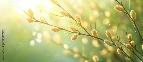 © AugmentArt, Fototapeta premium Golden willow catkins illuminated by sunlight swaying in the spring breeze showcasing the delicate beauty of early spring greenery.