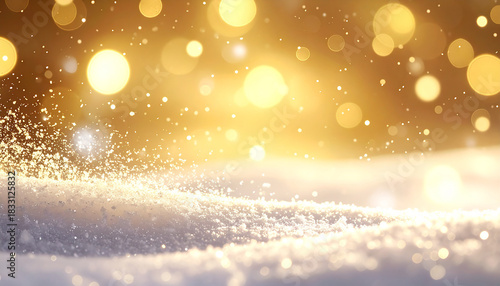 © Pearry, Naklejka premium Golden Winter Wonderland: A mesmerizing display of radiant golden bokeh and gently falling snow, creating a serene and magical atmosphere.