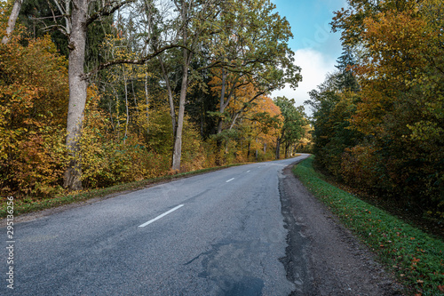 © Martins Vanags, Fototapeta premium golden yellow autumn road in sunny day