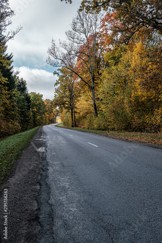 © Martins Vanags, Fototapeta premium golden yellow autumn road in sunny day