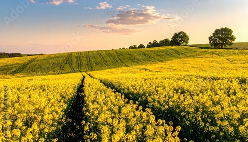 Obraz premium Golden Yellow Flower Field Under Beautiful Blue Sky at Sunset
