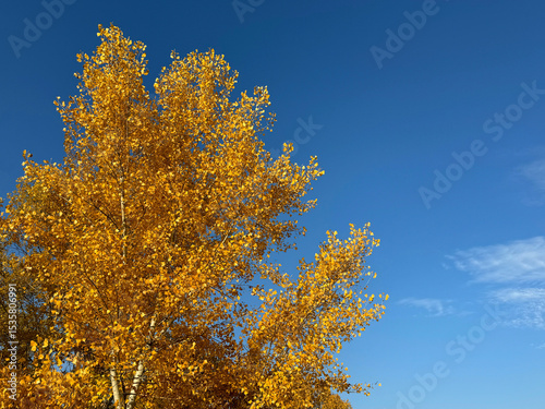 © OLENA LIALINA, Fototapeta premium Golden yellow foliage autumn aspen tree against sky