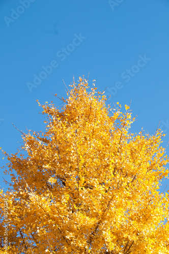 © eyeofpaul, Fototapeta premium Golden yellow ginkgo tree with blue sky in Tokyo Japan