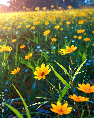 © SecretCanvas, Fototapeta premium Golden yellow wildflowers covering a sunlit meadow surrounded by trees on a bright day Anime Wallpaper Background Illustration Aesthetic