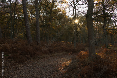 © Ines, Obraz premium Goldener Herbstwald mit Farnen in der Abendsonne