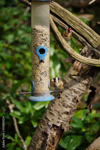 © Jowan Barnes, Naklejka premium Goldfinches eating seeds at a bird feeder